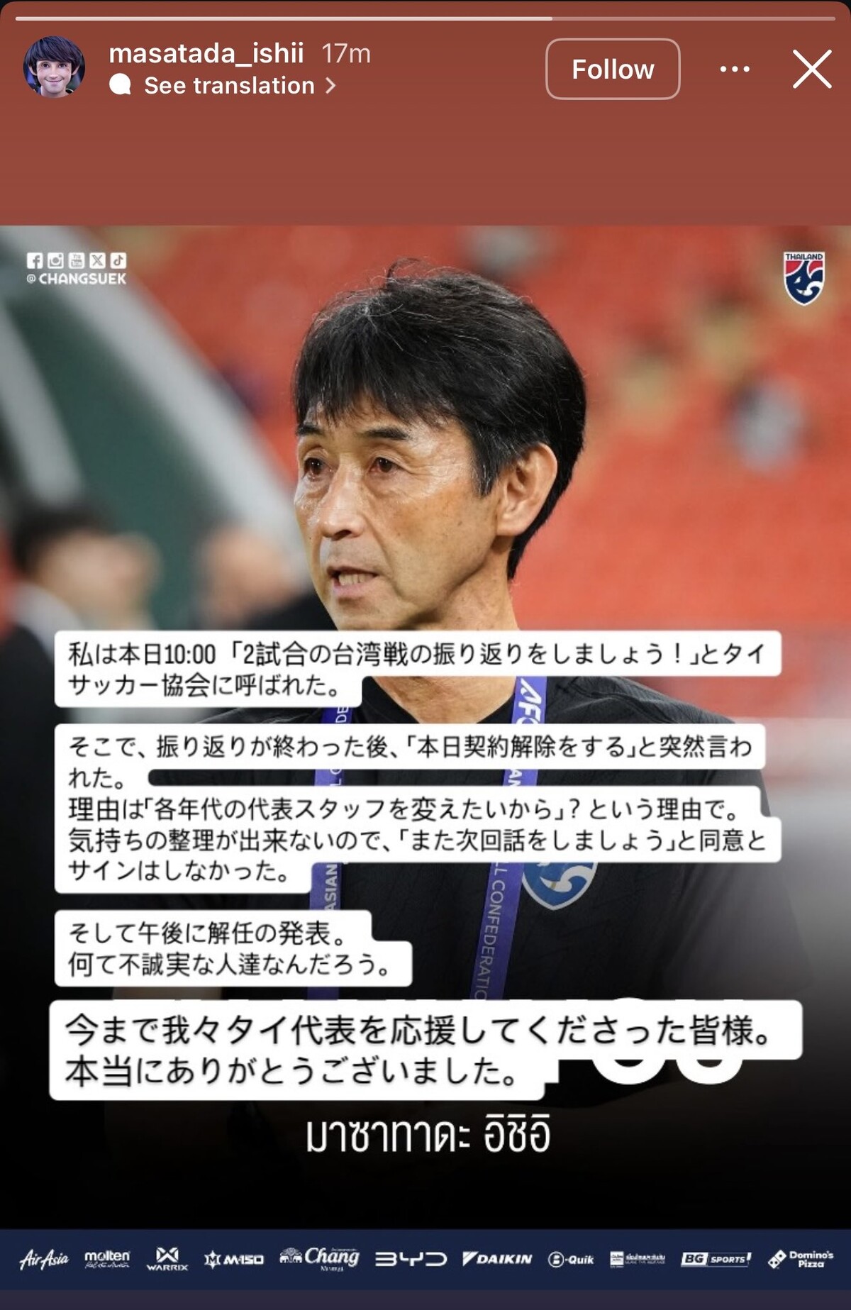 ◆悲報◆タイ代表監督石井ちゃん、突如解任になり激おこ!「なんて不誠実な人達なんだろう」