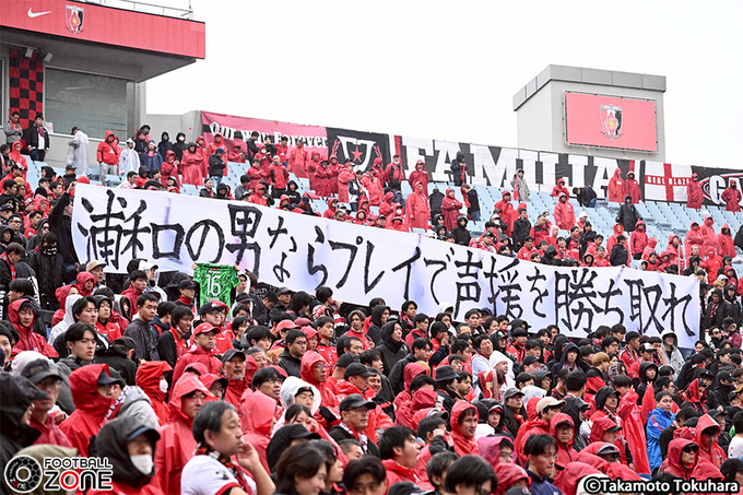 >「浦和の男ならプレイで声援を勝ち取れ」と書かれた横断幕をゴール裏に掲出し、