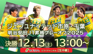 千葉テレビ(チバテレ)は9日、13日にフクダ電子アリーナで行われる、明治安田J1昇格プレーオフ2025決勝・ジェフユナイテッド市原・千葉対徳島ヴォルティス戦を、同日午後1時からミライチャンネル(第2チャンネル)で生中継すると発表した。