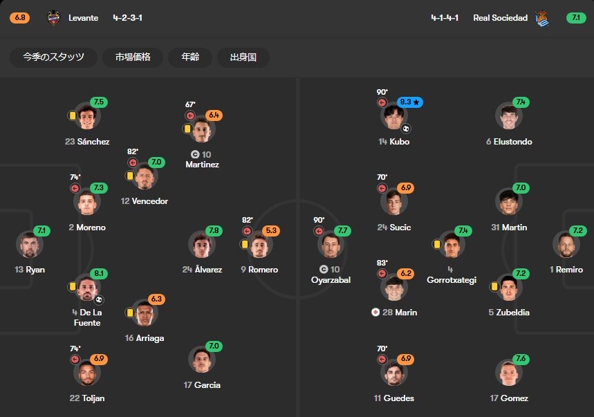 ◆リーガ◆17節 レバンテ戦ソシエダFW久保建英8.4で両チーム最高点