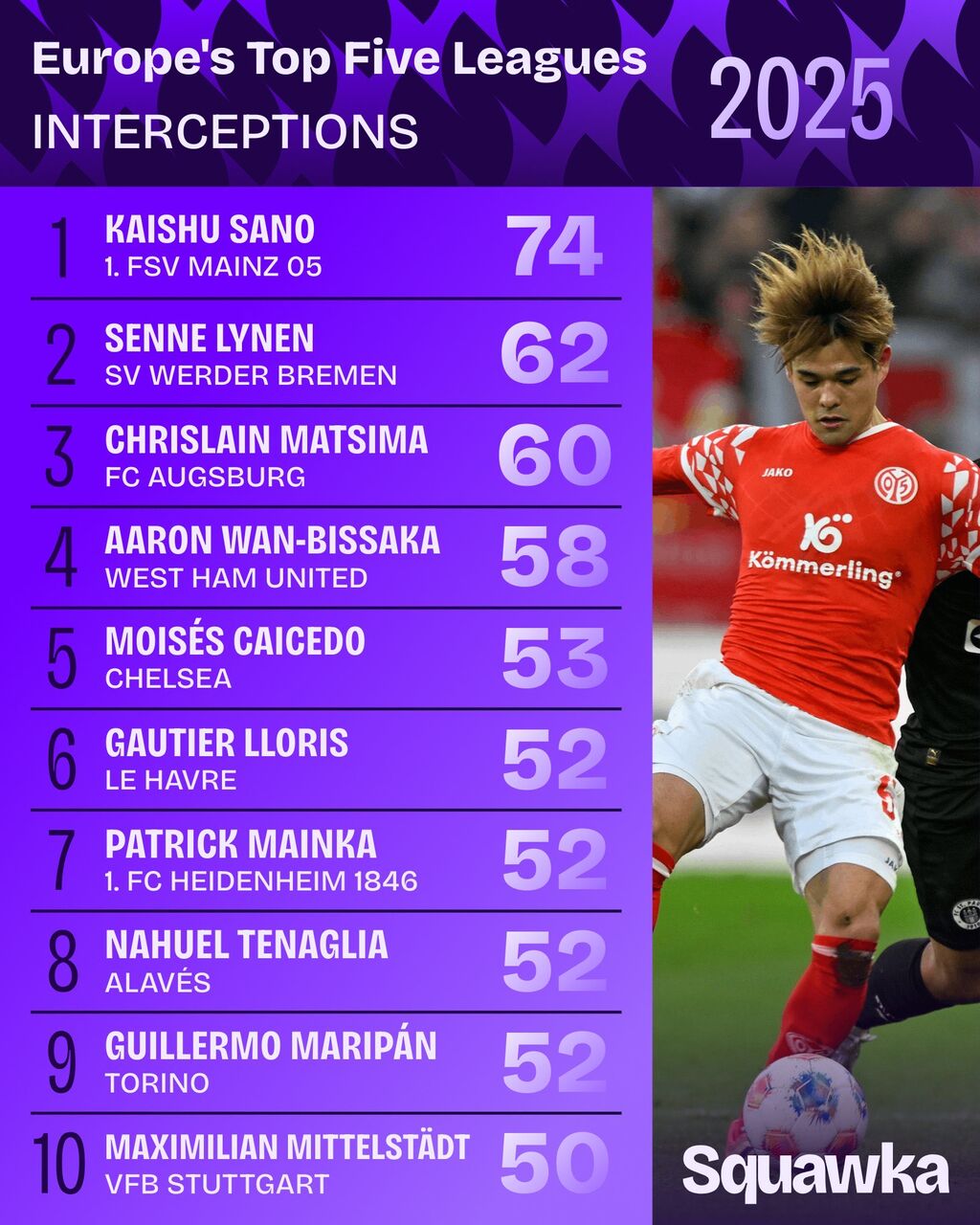 【朗報】佐野海舟が2025年欧州5大リーグのインターセプト王になるwwwwww