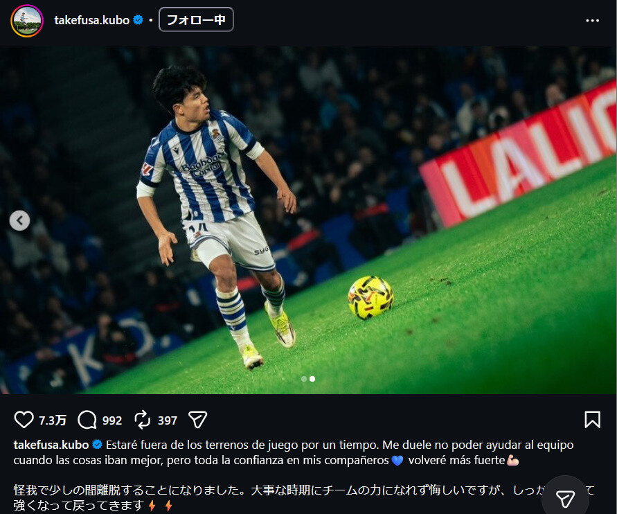◆リーガ◆バルサ戦で負傷の久保建英、インスタ更新!「少しの間離脱…強くなって戻ってきます⚡️⚡️」