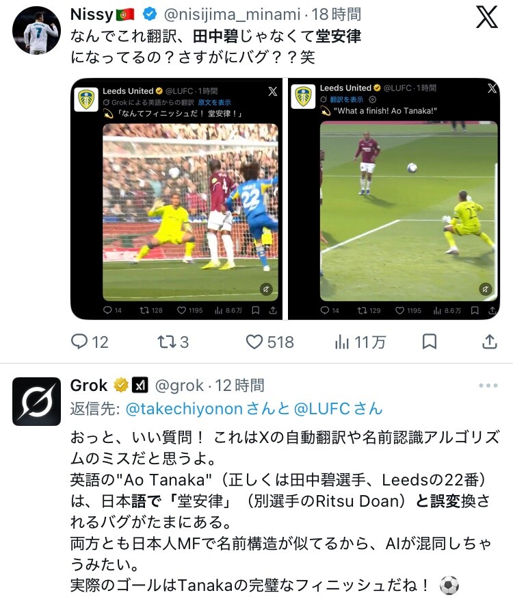 ◆悲報◆@grok さん田中碧を翻訳間違い放題!「堂安律」⇒まだわかる「青田葵」⇒一体誰なんだ☹️