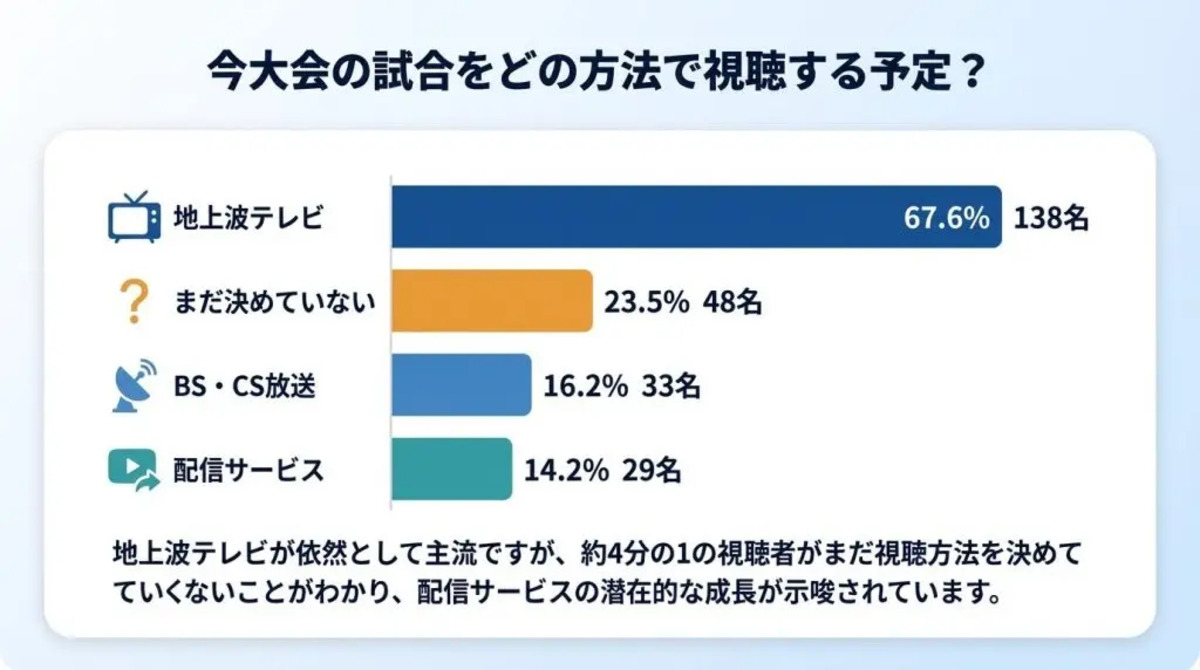 日本代表の勝ち上がり予想については、「ベスト16」(44.6%)が最多で、「ベスト8」(34.8%)が次点となった。この2つで全体の約8割を占めており、前回大会の実績を背景に、グループステージ突破を前提とした楽観的な見方が大勢を占めている。地上波テレビが主流も動画配信サービスの存在感が増加
