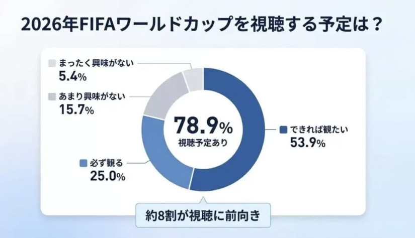 2026年W杯について、6人に1人が「仮病を使ってでも観たい」と回答し、全体の約8割が視聴に前向きであることが判明した。時差により多くの試合が日本時間の早朝から昼間に行われるため、仕事との両立が課題となっている。