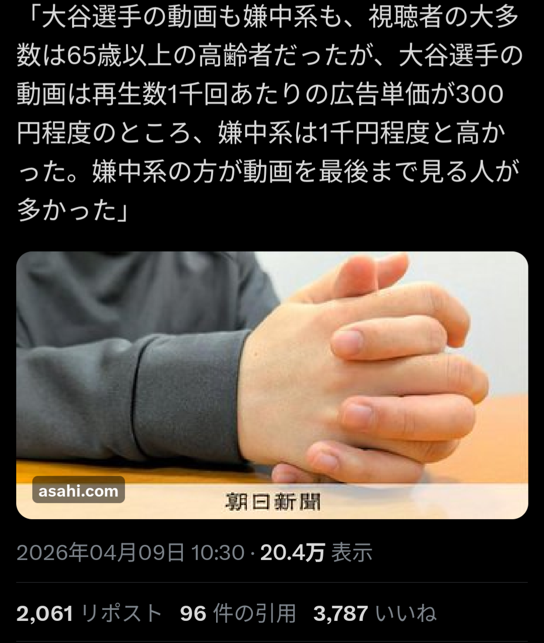 >大谷選手の動画も嫌中系も、視聴者の大多数は65歳以上の高齢者だった