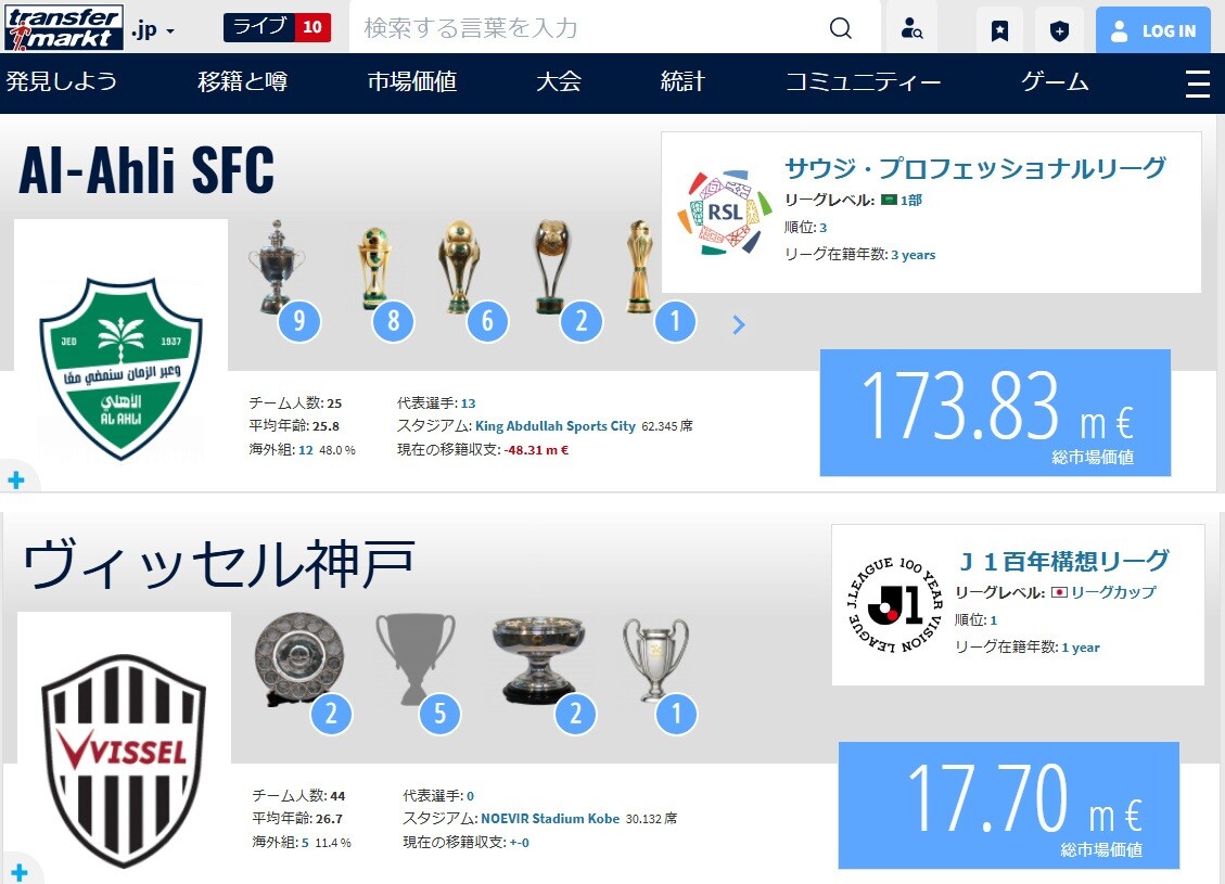 ◆悲報◆ACLE準決勝対戦アル・アハリの市場価値€173.8m,ヴィッセル神戸の指示王価値17.7m…10倍差