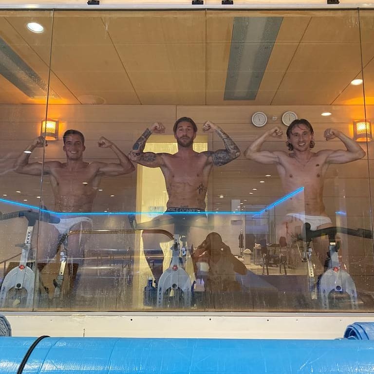 ◆画像◆ガラス張りサウナトレーニングルームでパンイチでバイクを漕いでガッツポーズのラモスとモドリッチがシュール過ぎて草w