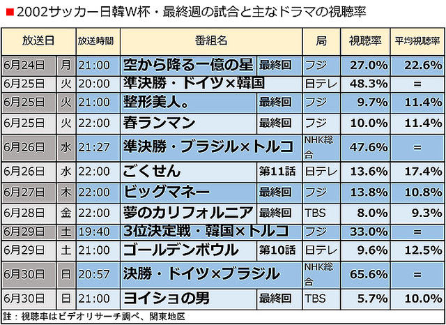 2002サッカー日韓W杯・最終週の試合と主なドラマの視聴率日韓共催W杯は6月30日の日曜に決勝戦が行われたが、6月24日の月曜から放送された主なドラマとサッカー中継を合わせて表にしてみた。ご覧いただきたい。