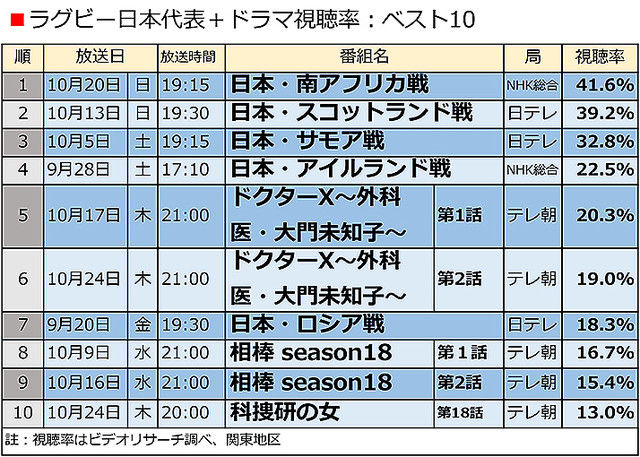 ラグビー日本代表+ドラマ視聴率:ベスト10細かく見れば、視聴率が持ち直しつつあるもの、さらに下落傾向を示しているものなど様々だが、