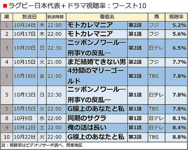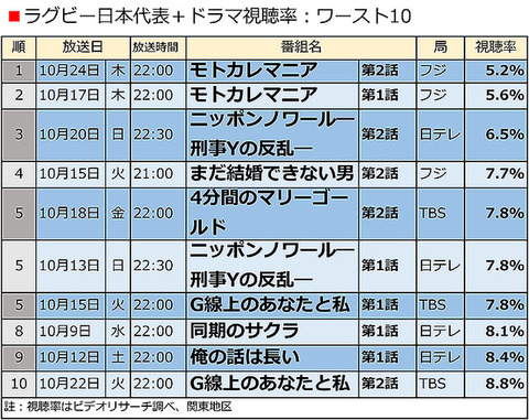 両局は視聴率三冠王の座を巡って激しく争っているが、それを象徴するような表になったと言えるだろう。では、次にご紹介する表はワースト10。文字通り、ラグビーW杯に「食われて」しまったドラマが並んでいる。