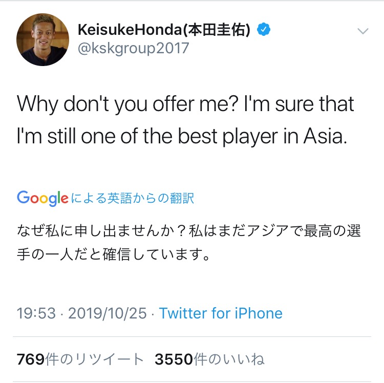10月25日、現在フリーの本田は、自身のツイッターで「Why don’t you offer me? I’m sure that I’m still one of the best player in Asia.」(オファーしたらどうだい? 俺はまだアジアで最高の選手のひとりだ)とつぶやいて騒がれた。